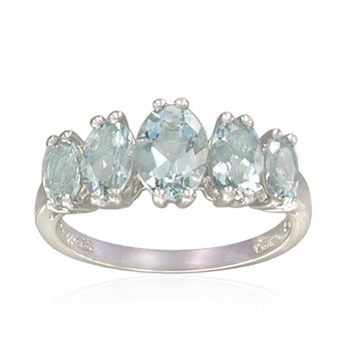 The Sterling Silver Oval-Shaped Aquamarine Ring shows off a timeless style with its single row of stunning graduated oval stones. The brilliant, oval-cut, natural aquamarine stones of this ring increase in size from each side with the largest stones at the center. Each sparkling stone is set in a polished silver-toned setting that complements the polished silver-toned band. The entire ring is made of 925 sterling silver, creating a beautiful contrast against the shimmering light blue aquamarine stones. This ring is an ideal size for everyday wear measuring .708 inches in width and .315 inches in height.